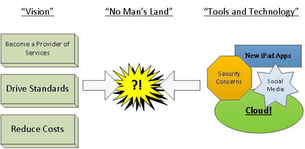 IT departments adopt technology from two perspectives: from a directive by the CIO to a “rogue IT” suggestion or project from an individual user. The former represents a top-down condition, while the latter has technology adoption from the bottom-up. Often times, there seems to be confusion somewhere in the middle, resulting in a smorgasbord of tools at one end, and a grand, ambitious strategy at the other end. This article suggests a framework to implement a vision from strategy, policy, process, and ultimately tools.